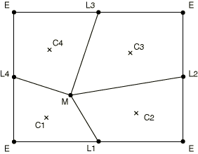 ProductsAbaqus/StandardAbaqus/CAE The ALE adaptive mesh sweeping algorithmAdaptive mesh smoothing is performed after the structural equilibrium equations have converged. The mesh smoothing equations are solved explicitly by sweeping iteratively over the adaptive mesh domain. During each mesh sweep, nodes in the domain are relocated—based on the positions of neighboring nodes obtained during the previous mesh sweep—to reduce element distortion. The new position, , of a node is obtained as where is the original position of the node, is the nodal displacement, are the neighboring nodal positions obtained during the previous mesh sweep, and are weight functions obtained from one or a weighted mixture of the following methods. The displacements applied during sweeps are not associated with mechanical behavior. Original configuration projectionOriginal configuration projection is the default in Abaqus/Standard and determines the weight function from a least squares minimization procedure that minimizes node displacement in a projection of the mesh back to the original configuration. This method of smoothing affects only deformations of the mesh and not the original mesh. Volume smoothingVolume smoothing determines the weight function by computing a volume-weighted average of the element centers in the elements surrounding the node. In Figure 1 the new position of node M is determined by a volume-weighted average of the positions of the element centers, C, of the four surrounding elements. The volume weighting will tend to push the node away from element center C1 and toward element center C3, thus reducing element distortion. Figure 1. Relocation of a node during a mesh sweep.