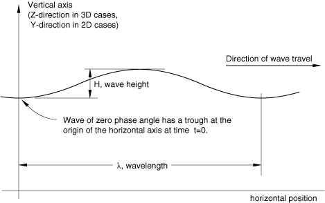 User-defined wave theory in Abaqus/StandardA user-defined wave theory can be coded in user subroutine UWAVE in an Abaqus/Aqua analysis in Abaqus/Standard. You can define the fluid particle velocity, acceleration, free surface elevation, and fluid pressure field in the user subroutine. For stochastic analysis, you can specify a random number seed, r, and define frequency/amplitude pairs that define the wave spectrum. During the analysis Abaqus/Aqua stores an intermediate configuration that can be used in the user subroutine to compute the stochastic description of the waves. The intermediate configuration is initialized as the reference configuration and is replaced by the current configuration only when requested by the user subroutine. In this way the stochastic description of the wave field can be stored in an external database and recalculated only when necessary. User-defined wave theory in Abaqus/ExplicitA user-defined wave theory can be coded in user subroutine VWAVE in an Abaqus/Aqua analysis in Abaqus/Explicit. You can define the fluid particle velocity, acceleration, free surface elevation, and fluid pressure field in the user subroutine. The quantities required to define the wave kinematics can be specified as properties and passed into the user subroutine. For example, in the case of stochastic wave kinematics, any required seed variable and/or frequency-amplitude data pairs can be specified as properties. You can also declare and use state variables for user-defined wave calculations, which will be provided at the nodes and initialized to zero at the beginning of the step. You have to update the state variables within the user subroutine. For example, the state variables can be used to store any intermediate configuration of the structure that is used to describe a stochastic wave field. Input File Usage Use the following option to specify the wave kinematics in user subroutine VWAVE: WAVE, TYPE=USER Use the following option to specify properties available as a real-array argument PROPS of size NPROPS in user subroutine VWAVE: WAVE, TYPE=USER, PROPERTIES=nprops prop_1, prop_2, ..., prop_8 ..., prop_nprops Use the following option to specify state variables available as a real-array argument STATEVAR of size NSTATEVAR in user subroutine VWAVE: WAVE, TYPE=USER, DEPVAR=nstatevar Wave position as a function of timeFor Airy and Stokes waves the position of the wave at time can be chosen by specifying the phase angle of the wave (or wave components for Airy waves). By default, the waves are chosen such that they have a trough (vertical displacement of the fluid surface is a minimum) at the origin of the horizontal axes at time . You can change this trough by introducing a phase angle for the waves. A positive phase angle shifts the waves backward in their travel direction (see Figure 1). Figure 1. Wave of zero phase angle.