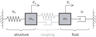 For an example of Abaqus/Standard to Abaqus/Explicit co-simulation, refer to Dynamic impact of a scooter with a bump. For detailed information on coupling Abaqus/Standard and Abaqus/Explicit, see Preparing an Abaqus analysis for co-simulation and Structural-to-structural co-simulation. Coupling using the MpCCI interfaceMpCCI, the multiphysics code coupling interface developed and distributed by the Fraunhofer-Institute for Algorithms and Scientific Computing (SCAI), provides an open system approach for general multidisciplinary simulations between Abaqus and any third-party analysis program that supports MpCCI. MpCCI provides a scalable communication infrastructure and mapping algorithms for multiple physics domains. In a co-simulation using MpCCI, Abaqus communicates in real time with the MpCCI coupling server to exchange fields with the third-party analysis program while each analysis advances its simulation time. Coupling through MpCCI may occur between Abaqus and any third-party analysis program that supports the MpCCI interface. This includes in-house codes that have the MpCCI adapter embedded. SIMULIA actively supports and qualifies a link between Abaqus and FLUENT for fluid-structure interaction. For further information on coupling using the MpCCI interface, contact http://www.mpcci.de. Additional applicationsThere are many other applications for which co-simulation can be employed with partner products. For example, vehicle ride comfort and durability simulation using FTire from http://www.cosin.eu. For a complete list of qualified partner products, see the http://www.3ds.com/support/certified-hardware/simulia-system-information/compatibility/co-simulation/ page at www.3ds.com/simulia. Strength of physics couplingYou will typically apply co-simulation techniques to problems where the most complex physics occurs within domains that are handled exclusively within an analysis program (e.g., Abaqus or a CFD analysis program). Due to the comparative numerical simplicity of the numerical techniques applied at the co-simulation interface, the physics controlling the interaction at the interface of the separate analysis domains (the strength of the physics coupling) must be relatively weak for the co-simulation technique to be applied effectively. Coupling to third-party analysis programsAnalysis domains are coupled in a staggered approach either using a globally explicit manner or an implicit iterative manner; that is, the equations for each domain are solved separately, and loads and boundary conditions are exchanged at the common interface. In cases where the coupling is sufficiently weak, the coupling may be required only in one direction (such as when an electromagnetic force field contributes to the structural response, but a reverse coupling provides no significant impact on the electromagnetic field). In an explicit staggered approach, such as the Gauss-Seidel coupling scheme, fields are exchanged only once per coupling step. This coupling strategy is applicable to problems that exhibit weak to moderate physics coupling (for example, aeroelasticity problems where you have air interacting with a relatively stiff structure). The explicit staggered approach requires a small coupling step size. In an implicit iterative approach, the fields are exchanged multiple times per coupling step until an overall equilibrium is achieved prior to advancing to the next coupling step. Implicit coupling is computationally more expensive per coupling step and generally can be employed to problems exhibiting moderate to strong physics coupling. In general, a larger coupling step size can be employed than for explicit schemes. Figure 1 illustrates the coupling strength with an analogy in the frequency domain. Consider a lumped parameter dynamic system with a coupling impedance directly related to a response frequency . In a staggered solution approach each domain is solved by temporarily ignoring the coupling terms represented by the gray spring and dashpot in Figure 1. Figure 1. Mechanical impedance analogy.