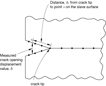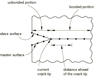 Crack propagation analysis is carried out on a nodal basis. The crack-tip node debonds when the fracture criterion, f, reaches the value 1.0 within a given tolerance: where and for VCCT, enhanced VCCT, and low-cycle fatigue criteria or for other fracture criteria. You can specify the tolerance . In Abaqus/Standard, if , the time increment is cut back such that the crack propagation criterion is satisfied except in the case of an unstable crack growth problem where multiple nodes at and ahead of a crack tip are allowed to debond without the cut back of increment size in one increment. The default value of is 0.1 for the critical stress, critical crack opening displacement, and crack length versus time criteria and is 0.2 for the VCCT, enhanced VCCT, and low-cycle fatigue criteria. Input File Usage FRACTURE CRITERION, TOLERANCE=, TYPE=type Abaqus/CAE Usage Interaction module: Create Interaction Property: Contact, , Type: VCCT or Enhanced VCCT, Tolerance Critical stress criterionThis criterion is available only in Abaqus/Standard. If you specify a critical stress criterion at a critical distance ahead of the crack tip, the crack-tip node debonds when the local stress across the interface at a specified distance ahead of the crack tip reaches a critical value. This criterion is typically used for crack propagation in brittle materials. The critical stress criterion is defined as where is the normal component of stress carried across the interface at the distance specified; and are the shear stress components in the interface; and and are the normal and shear failure stresses, which you must specify. The second component of the shear failure stress, , is not relevant in a two-dimensional analysis; therefore, the value of need not be specified. The crack-tip node debonds when the fracture criterion, f, reaches the value 1.0. If the value of is not given or is specified as zero, it will be taken to be a very large number so that the shear stress has no effect on the fracture criterion. The distance ahead of the crack tip is measured along the slave surface, as shown in Figure 1. The stresses at the specified distance ahead of the crack tip are obtained by interpolating the values at the adjacent nodes. The interpolation depends on whether first-order or second-order elements are used to define the slave surface. Figure 1. Distance specification for the critical stress criterion.