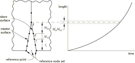 ![]() Abaqus/Standard computes the crack opening displacement at that point by interpolating the values at the adjacent nodes. The interpolation depends on whether first-order or second-order elements are used to define the slave surface. An error message will be issued if the value of n is not within the end points of the contact pair. Input File Usage FRACTURE CRITERION, TYPE=COD, DISTANCE=n Abaqus/CAE Usage The critical crack opening displacement criterion is not supported in Abaqus/CAE. Modeling symmetryIn problems where the debonding surfaces lie on a symmetry plane, you can specify that Abaqus/Standard should consider only half of the user-specified crack opening displacement values. In this case the initial bonding must be in the normal direction only (see Bonding only in the normal direction above). Input File Usage FRACTURE CRITERION, TYPE=COD, DISTANCE=n, SYMMETRY Abaqus/CAE Usage Modeling symmetry is not supported in Abaqus/CAE. Crack length versus time criterionThis criterion is available only in Abaqus/Standard. To specify the crack propagation explicitly as a function of total time, you must provide a crack length versus time relationship and a reference point from which the crack length is measured. This reference point is defined by specifying a node set. Abaqus/Standard finds the average of the current positions of the nodes in the set to define the reference point. During crack propagation the crack length is measured from this user-specified reference point along the slave surface in the deformed configuration. The time specified must be total time, not step time. The fracture criterion, f, is stated in terms of the user-specified crack length and the length of the current crack tip. The length of the current crack tip from the reference point is measured as the sum of the straight line distance of the initial crack tip from the reference point and the distance between the initial crack tip and the current crack tip measured along the slave surface. Referring to Figure 3, let node 1 be the initial location of the crack tip and node 3 be the current location of the crack tip. The distance of the current crack tip located at node 3 is given by where is the length of the straight line joining node 1 and the reference point, is the distance between nodes 1 and 2, and is the distance between nodes 2 and 3 measured along the slave surface. Figure 3. Crack propagation as a function of time.