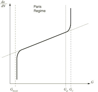 ![]() In the general case involving Mode I, II, and III the fracture criterion is defined as where is the equivalent strain energy release rate calculated at a node, and is the critical equivalent strain energy release rate calculated based on the user-specified mode-mix criterion and the bond strength of the interface. The crack-tip node will debond when the fracture criterion reaches the value of 1.0. Abaqus provides three common mode-mix formulae for computing : the BK law, the power law, and the Reeder law models. The choice of model is not always clear in any given analysis; an appropriate model is best selected empirically. BK lawThe BK law model is described in Benzeggagh (1996) by the following formula: To define this model, you must provide and . This model provides a power law relationship combining energy release rates in Mode I, Mode II, and Mode III into a single scalar fracture criterion. Input File Usage FRACTURE CRITERION, TYPE=VCCT, MIXED MODE BEHAVIOR=BK Abaqus/CAE Usage Interaction module: Create Interaction Property: Contact, , Type: VCCT, Mixed mode behavior: BK Power lawThe power law model is described in Wu (1965) by the following formula: To define this model, you must provide and . Input File Usage FRACTURE CRITERION, TYPE=VCCT, MIXED MODE BEHAVIOR=POWER Abaqus/CAE Usage Interaction module: Create Interaction Property: Contact, , Type: VCCT, Mixed mode behavior: Power Reeder lawThe Reeder law model is described in Reeder (2002) by the following formula: To define this model, you must provide and . The Reeder law is best applied when . When , the Reeder law reduces to the BK law. The Reeder law applies only to three-dimensional problems. Input File Usage FRACTURE CRITERION, TYPE=VCCT, MIXED MODE BEHAVIOR=REEDER Abaqus/CAE Usage Interaction module: Create Interaction Property: Contact, , Type: VCCT, Mixed mode behavior: Reeder Releasing multiple nodes in one increment in Abaqus/StandardFor an unstable crack growth problem, sometimes it is more efficient to allow multiple nodes at and ahead of a crack tip to debond in one increment without cutting back the increment size when the VCCT fracture criterion is satisfied. This capability is activated automatically if you specify an unstable growth tolerance, . In this case if the fracture criterion, f, is within the given unstable growth tolerance: where is the tolerance described earlier in this section, rather than cut back the increment size, more nodes at and ahead of the crack tip are allowed to debond in one increment until for all the nodes ahead of the crack tip. The forces at those debonded nodes are completely released immediately during the following increment. If you do not specify a value for the unstable growth tolerance, the default value is infinity. In this case the fracture criterion, f, for unstable crack growth is not limited by any upper-bound value in the above equation. Input File Usage FRACTURE CRITERION, TYPE=VCCT,UNSTABLE GROWTH TOLERANCE= Abaqus/CAE Usage Interaction module: Create Interaction Property: Contact, , Type: VCCT, toggle on Specify tolerance for unstable crack propagation: specify value Defining variable critical energy release ratesYou can define a VCCT criterion with varying energy release rates by specifying the critical energy release rates at the nodes. If you indicate that the nodal critical energy rates will be specified, any constant critical energy release rates you specify are ignored, and the critical energy release rates are interpolated from the nodes. The critical energy release rates must be defined at all nodes on the slave surface. Input File Usage Use both of the following options: FRACTURE CRITERION, TYPE=VCCT, NODAL ENERGY RATE NODAL ENERGY RATE Abaqus/CAE Usage Defining variable critical energy release rates is not supported in Abaqus/CAE. Enhanced VCCT criterionThis criterion is available only in Abaqus/Standard. The enhanced VCCT criterion is very similar to the original VCCT criterion described above. As in the original VCCT criterion, the fracture criterion in the general case involving Mode I, II, and III is defined as The crack-tip node debonds when the fracture criterion reaches the value of 1.0. However, unlike the original VCCT criterion, you can specify two different critical fracture energy release rates: for the onset of a crack and for the growth of a crack. When the enhanced VCCT criterion is used in the general case involving Mode I, II, and III fracture, the amount of energy dissipated associated with the release of the debonding force is controlled by the critical equivalent strain energy release rate required to propagate the crack, , rather than by the critical equivalent strain energy release rate required to initiate the crack, The formulae for calculating are identical to those used for for different mixed-mode fracture criteria. Input File Usage FRACTURE CRITERION, TYPE=ENHANCED VCCT Abaqus/CAE Usage Interaction module: Create Interaction Property: Contact, , Type: Enhanced VCCT Low-cycle fatigue criterionThis criterion is available only in Abaqus/Standard. If you specify the low-cycle fatigue criterion, progressive delamination growth at the interfaces in laminated composites subjected to sub-critical cyclic loadings can be simulated. This criterion can be used only in a low-cycle fatigue analysis using the direct cyclic approach (Low-cycle fatigue analysis using the direct cyclic approach). The onset and delamination growth are characterized by using the Paris law, which relates the relative fracture energy release rate to crack growth rates as illustrated in Figure 6. The fracture energy release rates at the crack tips in the interface elements are calculated based on the above mentioned VCCT technique. The Paris regime is bounded by the energy release rate threshold, , below which there is no consideration of fatigue crack initiation or growth, and the energy release rate upper limit, , above which the fatigue crack will grow at an acc