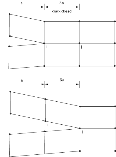 ![]() The fracture criterion, f, is given by where l is the length at the current time obtained from the user-specified crack length versus time curve. Crack-tip node 3 will debond when the failure function f reaches the value of 1.0 (within the user-defined tolerance). If geometric nonlinearity is considered in the step (Defining an analysis), the reference point may move as the body deforms; you must ensure that this movement does not invalidate the crack length versus time criterion. Abaqus/Standard does not extrapolate beyond the end points of your crack data. Therefore, if the first crack length specified is greater than the distance from the crack reference point to the first bonded node, the first bonded node will never debond and the crack will not propagate. In this case Abaqus/Standard will print warning messages in the message (.msg) file. Input File Usage FRACTURE CRITERION, TYPE=CRACK LENGTH, NSET=name Abaqus/CAE Usage The crack length versus time criterion is not supported in Abaqus/CAE. VCCT criterionThis criterion is available in both Abaqus/Standard and Abaqus/Explicit. The Virtual Crack Closure Technique (VCCT) criterion uses the principles of linear elastic fracture mechanics (LEFM) and, therefore, is appropriate for problems in which brittle crack propagation occurs along predefined surfaces. VCCT is based on the assumption that the strain energy released when a crack is extended by a certain amount is the same as the energy required to close the crack by the same amount. For example, Figure 4 illustrates the similarity between crack extension from i to j and crack closure at j. Figure 4. Mode I: The energy released when a crack is extended by a certain