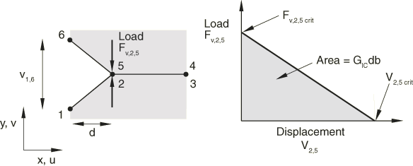 ![]() In Figure 5 nodes 2 and 5 will start to release when where is the Mode I energy release rate, is the critical Mode I energy release rate, b is the width, d is the length of the elements at the crack front, is the vertical force between nodes 2 and 5, and is the vertical displacement between nodes 1 and 6. Assuming that the crack closure is governed by linear elastic behavior, the energy to close the crack (and, thus, the energy to open the crack) is calculated from the previous equation. Similar arguments and equations can be written in two dimensions for Mode II and for three-dimensional crack surfaces including Mode III. Figure 5. Pure Mode I modified.