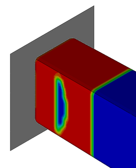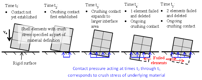 ![]() CZone methodologyFigure 4 shows a simple example of a crushable shell interacting with a rigid body with the CZone capability. The example represents a situation in which a thin part modeled with shells with initial velocity, , is crushed against a fixed rigid body using the CZone capability. During active crushing, the magnitude of the contact pressure is governed by the crush stress of the underlying material. In this example the magnitude of the contact pressure (shown in blue in Figure 4) does not change while crushing is active. Figure 4. CZone continuous crushing