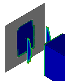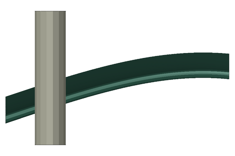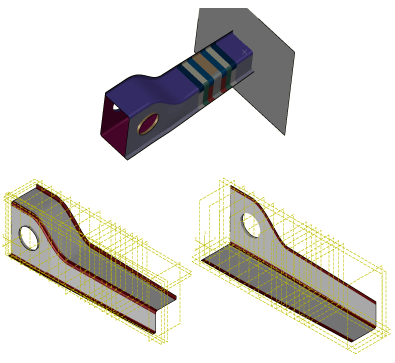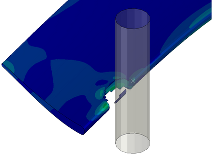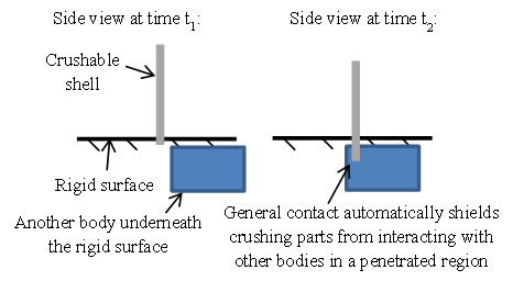 ![]() Significant penetrations can occur as a result of limiting the contact pressure to the crush stress of the underlying material. Shell elements involved in CZone crushing fail and are deleted once all nodes of a shell element penetrate the surface being impacted, such as in the two configurations on the right side of Figure 4. The crush stress can account for various material failure mechanisms, such as delamination, matrix cracking, fiber breakage, fiber pull-out, and fiber buckling, although the CZone capability does not attempt to distinguish between the various failure mechanisms. Even though the crush stress is specified as a material characteristic, the direct effect of the crush stress is limited to the contact pressure calculations; that is, constitutive (material) calculations for elements that are still active do not consider crush stress aspects of the material definition. As discussed in the context of Figure 4, penetrations on the order of element dimensions are expected in the crushing region. The implementation of the CZone capability in general contact includes a shielding mechanism to avoid undesired secondary contacts for parts undergoing crushing. For example, this shielding mechanism avoids undesired interactions between the crushable shell and the body below the thin rigid body in Figure 5. Figure 5. Example of automatic shielding from secondary contacts during