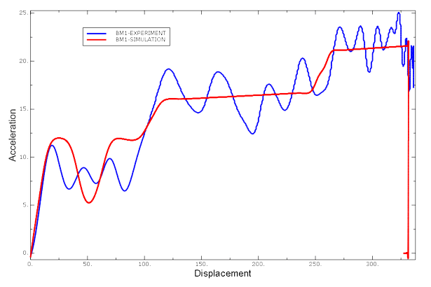 ![]() Acceleration histories of the experimental and analysis results correlate well, as shown in Figure 24. The acceleration of the analysis approaches a constant value near zero after the crushing event, as shown by the red curve. The acceleration of the experimental results exhibit some experimental noise after passing through zero, as shown by the blue curve. Figure 24. Time history of the sled acceleration for the complex cone.
