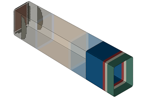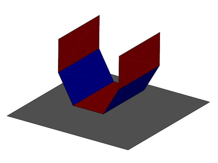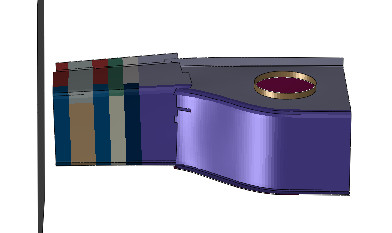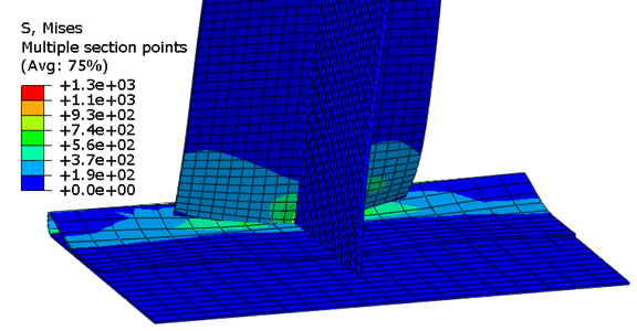 Complex intersections and domain decomposition in CZone for AbaqusFigure 7 shows a close-up view of a part with a T-junction geometry crushing against different sides of a folded shell in different regions. The folded shell experiences self-contact. This example shows that crushable bodies can have complex geometries, that crushing can occur with a double-sided target surface, and that noncrushing contact can occur nearby crushing contact. Figure 7. Crushing of a T-junction part against a folded shell surface.