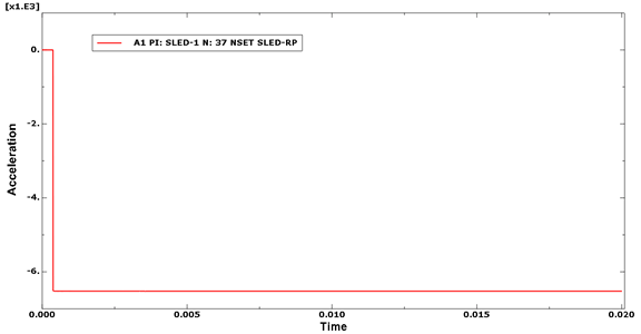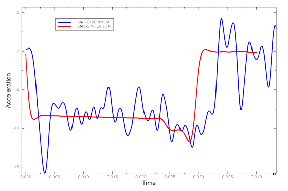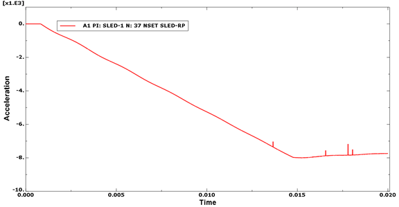 ![]() The predicted sled acceleration curve also matches well with the test data, as shown in Figure 20. Figure 20. History of the sled acceleration for the simulation and