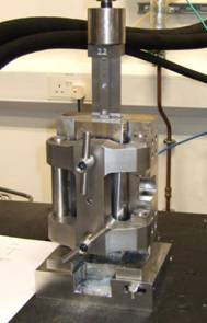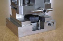 The high cost of this test method has led to the development of lower cost coupon test methods described in the following sections. Flat coupon testingSeveral organizations are developing the flat coupon testing method. Test coupons are typically cut from a flat sheet using a water jet to minimize damage at the cut edges. One end of the coupon is weakened by incorporating a saw-tooth shape or chamfer to initiate crushing. The flat coupon is placed in a fixture that prevents buckling. A drop-tower or servo-hydraulic test apparatus is used to push the coupon through the fixture onto a crushing or target plate. The ongoing crush force is divided by the cross-sectional area of the flat coupon to determine the crush strength. In the flat coupon testing method, the coupon typically has a region near the crushing end that is free from support or constraint. This region is the unsupported length. Figure 8 shows a coupon crushing fixture installed in a servo-hydraulic dynamic testing apparatus. Figure 8. Flat coupon test apparatus (courtesy of Engenuity, Ltd.).