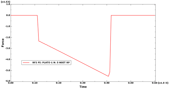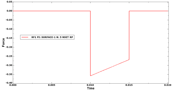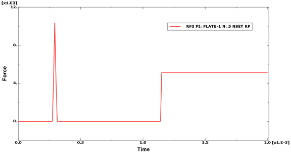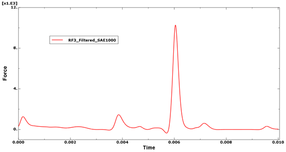 ![]() The crush force increases as the first tapered element crushes against the rigid surface. The increasing load causes the element behind the tapered element to fail as a result of brittle failure. The first element is free to bounce from the surface as the rest of the structure continues toward it. The reaction force at the rigid reference node is shown in Figure 39. Figure 39. The reaction force at the rigid reference node.