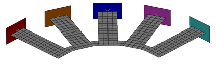 ![]() Five fingerIn this test a single composite specimen, with five fingers and a central palm, is completely constrained. The composite has a simple layup composed of 10 layers of orthotropic material. The crush resistance is a function of angle for this material defined for the crush stress. The input file for this example is cza_v5_gc.inp. Five individual sleds are defined, each paired with a finger on the composite component, as shown in Figure 31. Figure 31. The initial configuration of the five finger model.