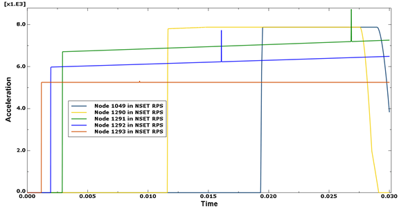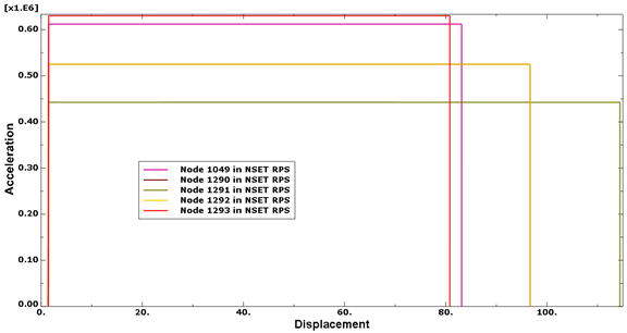 ![]() The sleds travel toward and along the length of the fingers with an initial velocity. The progress of the sleds is resisted by the force required to crush the composite fingers. The angular dependence of the crush resistance means that each sled travels a different distance along the fingers. The displacement versus acceleration for each sled is shown in Figure 32. Note: Two of the curves—the ones for nodes 1290 and 1292—are identical, so there appear to be only four curves in the graph. This is the result of the angular properties of the second and fourth fingers having identical crushing properties in the test direction. Figure 32. The displacement versus acceleration for each of the five