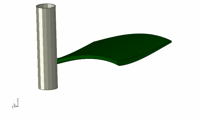 ![]() After initial impact, the failure mode becomes crushing as the impact continues and new composite material is exposed. Eventually the forces become too great, and failure is observed where the airfoil joins the nose (the boundary condition on the edge of the airfoil away from the pole). As this failure occurs, the composite structure rotates and the crushing ceases. This verification problem tests the implementation of the Tsai-Wu failure criteria and the transition from bouncing (hard contact) to crushing. The difference in the failure modes is shown in Figure 36 and Figure 37. All failed elements from both crushing and brittle failure have been removed from Figure 36. Only elements that failed as a result of crushing have been removed from Figure 37. The removal of failed elements in Abaqus/CAE is discussed in Output. Figure 36. Airfoil with all failed elements removed.