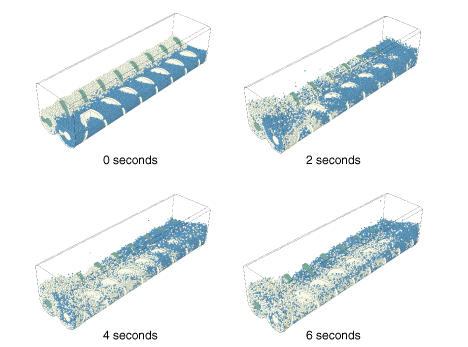 ProductsAbaqus/ExplicitAbaqus/Viewer IntroductionThe discrete element method (DEM) is an intuitive method in which discrete particles collide with each other and with other surfaces during an explicit dynamic simulation. Typically, each DEM particle represents a separate grain, tablet, shot peen, etc. DEM is not applicable to situations in which individual particles undergo complex deformation. Therefore, DEM is unlike, and conceptually simpler than, the smoothed particle hydrodynamic (SPH) method in which groups of particles collectively model a continuum body (see Smoothed particle hydrodynamics). For example, DEM is well-suited for particle mixing applications, such as that shown in Figure 1. In this application DEM is used to model the initially separated blue and white particles, and rigid finite elements are used to model two mixing augers and the box-shaped container. The sequence of deformed plots in Figure 1 shows the particle response as the augers turn. DEM results for simulations such as this are often best viewed with animations. Another example of using DEM for a mixing application is described in Mixing of granular media in a drum mixer. Figure 1. DEM particle mixing example.
