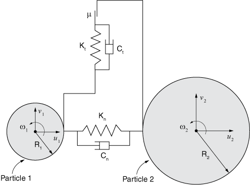 Modeling contact between DEM particles requires that the particles be explicitly included in general contact as element-based surfaces using contact inclusions (see Element-based surface definition). See About general contact in Abaqus/Explicit for a discussion of general contact. By default, the particles are not part of the general contact domain, similar to other 1-node elements (such as point masses). Contact stiffness for DEM is often intended to account for the physical stiffness characteristics of the particles because DEM models each particle as rigid; therefore, nondefault contact property assignments are common for DEM interactions. Normal and tangential contact forcesFigure 4 is a schematic representation of the contact stiffness and damping between two particles. The spring stiffness acts in the contact normal direction and may represent a simple linear or a nonlinear contact stiffness. The dashpot represents contact damping in the normal direction. The tangential spring stiffness along with the friction coefficient represent friction between the particles. The dashpot represents contact damping in the tangential direction. Figure 4. Normal and tangential contact interaction between two discrete