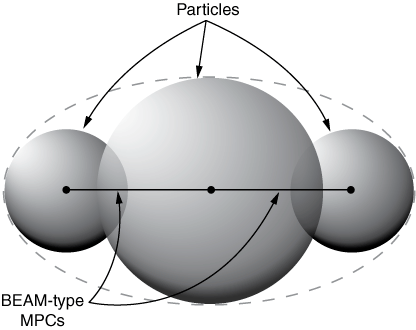 ![]() The particles in a cluster may overlap with each other. Contact forces that try to push apart overlapping particles of a cluster will exist unless contact exclusions are specified among particles of a cluster (see Specifying contact exclusions). These contact forces will have no effect on particles held together rigidly but are problematic for clusters with compliant connections. The particle-cluster approach may not replicate the precise geometry of actual grains. For example, the cluster shown in Figure 3 may approximate an ellipsoidal shape (indicated by the dashed line in the figure). More spherical particles of various sizes can be added to the cluster to obtain a closer approximation of the true shape. Define BEAM-type multi-point constraints between nodes of a group of particles to create a rigid cluster, or define connector elements between nodes of particles to create a rigid or deformable cluster. Appropriate constitutive behavior can be defined for connector elements to capture compliant behavior for particle connections within a cluster. Clusters of overlapping particles that do not involve multi-point constraints or connectors may exhibit nonphysical behavior. For more information, see General multi-point constraints and About connectors. InteractionsContact is an essential ingredient for DEM analyses, as discussed above. General contact is used to define contact involving DEM particles. A DEM particle can be involved in multiple contact interactions simultaneously with