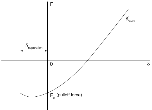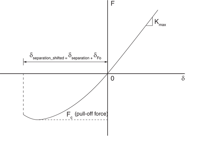 ![]() It can be seen from Figure 5 that adhesive forces are nonzero at and reduce to zero at . In some situations it may be desirable to have zero adhesive forces when . You can achieve this by applying a horizontal shift of to the force-displacement curve shown in Figure 5. Figure 6 shows the shifted curve. The pull-off force remains unchanged due to the shift, whereas the new separation distance . Abaqus automatically computes the horizontal shift for the “shifted” JKR type adhesive behavior. Figure 6. Force versus approach distance relation for the shifted JKR model.
