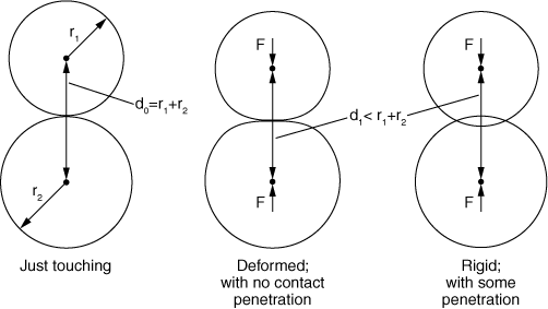 ![]() Each DEM particle is modeled with a single-node element of type PD3D. These elements are rigid spheres with specified radii. Nodes of PD3D elements have displacement and rotational degrees of freedom. Rotations of DEM particles can significantly influence contact interactions when friction is considered. General contact definitions are easily extended to include interactions among DEM particles and interactions between DEM particles and finite-element-based (or analytical) surfaces. Large relative motion among particles is typical for DEM applications. Particle-to-particle interactions can involve like or unlike particles. Each particle can be involved in many contact interactions simultaneously. DEM particle interactions use finite contact stiffness, which introduces some compliance into the particle systems. For example, the contact stiffness can be specified such as to reflect the macroscopic stiffness of a packed granular material model with DEM. For example, consider the interactions between the two spherical particles shown in Figure 2. Figure 2. Interactions between spherical particles.