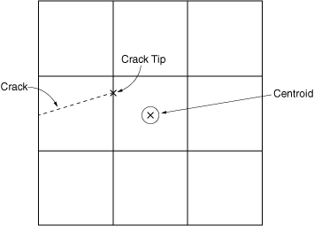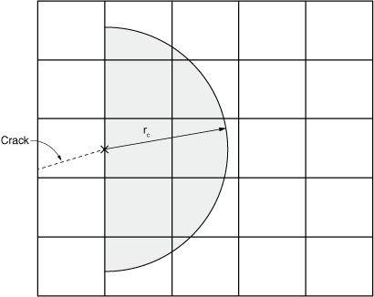 ![]() Input File Usage DAMAGE INITIATION, POSITION=CENTROID (default) Abaqus/CAE Usage Property module: material editor: : , , , , Maxpe Damage, or Maxps Damage: Computing the stress and strain fields at the crack tipWith a sufficiently refined mesh, the centroidal approximation is accurate and economical. However, if the finite element mesh in the vicinity of the crack tip is coarse relative to the gradients in the stress/strain fields, the default centroidal approximation may not be sufficient. In such cases you can use the stress/strain extrapolated to the crack tip to determine if the damage initiation criterion is satisfied and to determine the crack propagation direction. See Figure 7. Input File Usage DAMAGE INITIATION, POSITION=CRACKTIP Abaqus/CAE Usage Property module: material editor: : , , , , Maxpe Damage, or Maxps Damage: Combining crack tip and centroidal calculationsYou can also choose to combine the two previous alternatives: you can use the stress/strain values extrapolated to the crack tip to determine if the damage initiation criterion is satisfied, and you can use the stress/strain values at the element centroid to determine the crack propagation direction. Input File Usage DAMAGE INITIATION, POSITION=COMBINED Abaqus/CAE Usage Property module: material editor: : , , , , Maxpe Damage, or Maxps Damage: Nonlocal averaging of the stress and strain fields to improve the accuracy of crack propagation directionsThe three options for evaluating the stress and strain fields discussed above are local calculations in the sense that the evaluated fields are local to the single element ahead of the crack tip. In the case of coarse and/or unstructured meshes a nonlocal averaging of the stress and strain fields ahead of the crack tip can lead to a more accurate evaluation of those fields, which can improve the accuracy of the computed propagation directions. See Figure 8. Figure 8. Nonlocal averaging region.