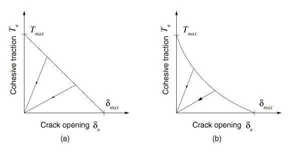 ![]() Input File Usage DAMAGE INITIATION, POSITION=NONLOCAL Abaqus/CAE Usage Nonlocal averaging of the stress/strain fields ahead of the crack tip is not supported in Abaqus/CAE. Specifying the region of the model used for nonlocal averagingTo control the range of elements used for nonlocal averaging in the crack direction calculations, you can specify a radius, , within which the elements ahead of the crack tip are included. The default radius is three times the typical element characteristic length in the enriched region. Input File Usage DAMAGE INITIATION, R CRACK DIRECTION= Abaqus/CAE Usage Specifying the range of the model for nonlocal averaging is not supported in Abaqus/CAE. Smoothing the stress/strain fields before averagingTo further improve the nonlocal averaging, you can request an initial smoothing of the stress/strain fields ahead of the crack. In this case Abaqus/Standard averages the field values to element nodes and then interpolates the smoothed fields to the integration points. Once smoothing is complete, the nonlocal averaging is applied. No smoothing is applied by default. Input File Usage Use one of the following options: DAMAGE INITIATION, SMOOTHING=NONE (default) DAMAGE INITIATION, SMOOTHING=NODAL Abaqus/CAE Usage Smoothing the stress/strain fields before averaging is not supported in Abaqus/CAE. Weighting schemes for nonlocal averagingAbaqus/Standard offers a number of weighting schemes for field smoothing that provide additional control over nonlocal averaging. For example, you may want to give a higher weighting to elements close to the crack tip. You can specify a weight function, , to compute the average stress/strain based on the distance from the element integration points to the crack tip, . By default, a uniform weighting is applied to all elements used for averaging; alternatively, you can use a Gaussian function or a cubic spline function. You can also define a weight function with a user subroutine. The Gaussian function is represented by: Input File Usage Use one of the following options: DAMAGE INITIATION, WEIGHTING METHOD=UNIFORM (default) DAMAGE INITIATION, WEIGHTING METHOD=GAUSS DAMAGE INITIATION, WEIGHTING METHOD=CUBIC SPLINE DAMAGE INITIATION, WEIGHTING METHOD=USER Abaqus/CAE Usage Specifying a weighting scheme for nonlocal averaging is not supported in Abaqus/CAE. Damage evolutionThe damage evolution law describes the rate at which the cohesive stiffness is degraded once the corresponding initiation criterion is reached. The general framework for describing the evolution of damage is conceptually similar to that used for damage evolution in surface-based cohesive behavior (Contact cohesive behavior). A scalar damage variable, D, represents the averaged overall damage at the intersection between the crack surfaces and the edges of cracked elements. It initially has a value of 0. If damage evolution is modeled, D monotonically evolves from 0 to 1 upon further loading after the initiation of damage. The normal and shear stress components are affected by the damage according to where , , and are the normal and shear stress components predicted by the elastic traction-separation behavior for the current separations without damage. To describe the evolution of damage under a combination of normal and shear separations across the interface, an effective separation is defined as The combination option DAMAGE EVOLUTION, TYPE=ENERGY, SOFTENING=EXPONENTIAL is not recommended to be used with XFEM. Abaqus/CAE Usage Property module: material editor: : Maxpe Damage or Maxps Damage: Use in conjunction with user-defined damage initiation criterionA separate damage evolution law should be specified for each damage initiation criterion defined in user subroutine UDMGINI. Each combination of a damage initiation criterion and a corresponding damage evolution law is referred to as a failure mechanism. Damage will accumulate for only one failure mechanism per element, corresponding to the mechanism whose damage initiation criterion was achieved first. Input File Usage Use the following options to specify damage evolution laws for multiple user-defined damage initiation criteria: DAMAGE INITIATION, CRITERION=USER, FAILURE MECHANISMS= DAMAGE EVOLUTION, FAILURE INDEX=1 DAMAGE EVOLUTION, FAILURE INDEX=2 ... DAMAGE EVOLUTION, FAILURE INDEX= Abaqus/CAE Usage Defining a user-defined damage initiation criterion is not supported in Abaqus/CAE. Viscous regularization in Abaqus/StandardModels exhibiting various forms of softening behavior and stiffness degradation often lead to severe convergence difficulties in Abaqus/Standard. Viscous regularization of the constitutive equations defining cohesive behavior in an enriched element can be used to overcome some of these convergence difficulties. Viscous regularization damping causes the tangent stiffness matrix to be positive definite for sufficiently small time increments. The approximate amount of energy associated with viscous regularization over the whole model is available using output variable ALLVD. Abaqus/CAE Usage Property module: material editor: : , , , , Maxpe Damage, or Maxps Damage: Defining the constitutive response of fluid flow within the cracked element surfacesThe formulae and laws that govern the behavior of fluid flow within the XFEM-based cracked element surfaces are very similar to those used for fluid flow within the cohesive element gap (Defining the constitutive response of fluid within the cohesive element gap). The similarities extend to the traction-separation model, damage initiation criteria, damage evolution law, and the fluid flow behavior. The fluid constitutive response comprises the tangential flow within the cracked element surfaces and the normal flow across the cracked element surfaces due to caking or fouling effects in the enriched elements. Tangential flowThe tangential flow within the cracked element surfaces can be modeled with either a Newtonian or power-law model. By default, there is n