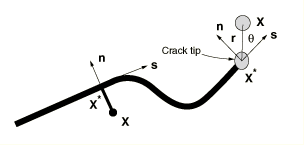 ProductsAbaqus/StandardAbaqus/CAEAbaqus/Viewer Modeling approachModeling stationary discontinuities, such as a crack, with the conventional finite element method requires that the mesh conforms to the geometric discontinuities. Creating a conforming mesh can be quite difficult. Modeling a growing crack is even more cumbersome because the mesh must be updated continuously to match the geometry of the discontinuity as the crack progresses. The extended finite element method (XFEM) alleviates the need to create a conforming mesh. The extended finite element method was first introduced by Belytschko and Black (1999). It is an extension of the conventional finite element method based on the concept of partition of unity by Melenk and Babuska (1996), which allows local enrichment functions to be easily incorporated into a finite element approximation. The presence of discontinuities is ensured by the special enriched functions in conjunction with additional degrees of freedom. However, the finite element framework and its properties such as sparsity and symmetry are retained. XFEM does not alleviate the need for sufficient mesh refinement in the vicinity of the crack tip. Introducing nodal enrichment functionsFor the purpose of fracture analysis, the enrichment functions typically consist of the near-tip asymptotic functions that capture the singularity around the crack tip and a discontinuous function that represents the jump in displacement across the crack surfaces. The approximation for a displacement vector function with the partition of unity enrichment is where are the usual nodal shape functions; the first term on the right-hand side of the above equation, , is the usual nodal displacement vector associated with the continuous part of the finite element solution; the second term is the product of the nodal enriched degree of freedom vector, , and the associated discontinuous jump function across the crack surfaces; and the third term is the product of the nodal enriched degree of freedom vector, , and the associated elastic asymptotic crack-tip functions, . The first term on the right-hand side is applicable to all the nodes in the model; the second term is valid for nodes whose shape function support is cut by the crack interior; and the third term is used only for nodes whose shape function support is cut by the crack tip. Figure 1. Illustration of normal and tangential coordinates for a smooth