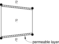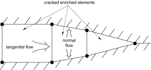 ![]() The magnitude of the separation is governed by the cohesive law until the cohesive strength of the cracked element is zero, after which the phantom and the real nodes move independently. To have a set of full interpolation bases, the part of the cracked element that belongs in the real domain, , is extended to the phantom domain, . Then the displacement in the real domain, , can be interpolated by using the degrees of freedom for the nodes in the phantom domain, . The jump in the displacement field is realized by simply integrating only over the area from the side of the real nodes up to the crack; i.e., and . This method provides an effective and attractive engineering approach and has been used for simulation of the initiation and growth of multiple cracks in solids by Song (2006) and Remmers (2008). It has been proven to exhibit almost no mesh dependence if the mesh is sufficiently refined. Modeling hydraulically driven fractureThe cohesive segments method in conjunction with phantom nodes discussed above can also be extended to model hydraulically driven fracture. In this case additional phantom nodes with pore pressure degrees of freedom are introduced on the edges of each enriched element to model the fluid flow within the cracked element surfaces in conjunction with the phantom nodes that are superposed on the original real nodes to represent the discontinuities of displacement and fluid pressure in a cracked element. The phantom node at each element edge is not activated until the edge is intersected by a crack. The flow patterns of the pore fluid in the cracked elements are shown in Figure 3. The fluid is assumed to be incompressible. The fluid flow continuity, which accounts for both tangential and normal flow within and across the cracked element surfaces as well as the rate of opening of the cracked element surfaces, is maintained. The fluid pressure on the cracked element surfaces contributes to the traction-separation behavior of the cohesive segments in the enriched elements, which enables the modeling of hydraulically driven fracture. Figure 3. Flow within a cracked element.