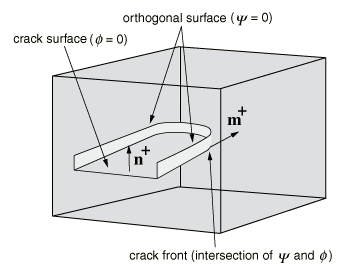 ![]() Using the level set method to describe discontinuous geometryA key development that facilitates treatment of cracks in an extended finite element analysis is the description of crack geometry, because the mesh is not required to conform to the crack geometry. The level set method, which is a powerful numerical technique for analyzing and computing interface motion, fits naturally with the extended finite element method and makes it possible to model arbitrary crack growth without remeshing. The crack geometry is defined by two almost-orthogonal signed distance functions, as illustrated in Figure 5. The first, , describes the crack surface, while the second, , is used to construct an orthogonal surface so that the intersection of the two surfaces gives the crack front. indicates the positive normal to the crack surface; indicates the positive normal to the crack front. No explicit representation of the boundaries or interfaces is needed because they are entirely described by the nodal data. Two signed distance functions per node are generally required to describe a crack geometry. Figure 5. Representation of a nonplanar crack in three dimensions by two signed