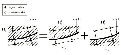 Use of unsymmetric matrix storage and solutionWhen the pore pressure degrees of freedom are activated in the enriched elements, matrices are unsymmetric; therefore, unsymmetric matrix storage and solution may be needed to improve convergence (see Matrix storage and solution scheme in Abaqus/Standard). VisualizationA crack can be visualized through the iso-surface for the signed distance function PHILSM. If a crack cuts through a very tiny corner of an enriched element, the displacements along the crack front in the enriched element may be distorted in rare cases in the Visualization module of Abaqus/CAE (Abaqus/Viewer) when displaying the contours. The distortion, however, is not present when viewing only the deformed shape. When an element is cut through by a crack, the cracked element splits into two parts, each part formed by a real domain and a phantom domain, as illustrated in Figure 2. Contour plot integration point values for cracked elements consider contributions from only the real domains in both parts of the cracked elements. However, when you probe cracked elements, only the contribution from the part of the elements containing the real domain and the phantom domain is reported. When evaluating the contour integrals in a stationary crack, additional integration stations are introduced internally in the elements enriched with singular asymptotic crack-tip fields. However, visualization of the element output variables in those additional integration points is not supported in the Visualization module of Abaqus/CAE (Abaqus/Viewer). LimitationsThe following limitations exist with an enriched feature: