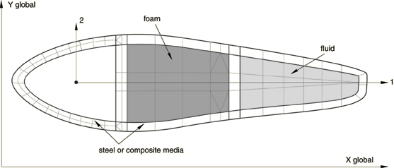 ProductsAbaqus/StandardAbaqus/Explicit IntroductionThe response of some structures is beam-like, yet the beam cross-section geometry or multi-material makeup of the cross-section do not permit the use of a predefined library beam cross-section. In these cases a meshed cross-section can be used to model the beam cross-section and to generate beam cross-section properties appropriate for subsequent use in a Timoshenko beam analysis. The beam properties are generated assuming a thick-walled (solid) cross-section with unconstrained out-of-plane warping, so open-section beam elements cannot use the beam cross-section properties generated from the meshed section (see About beam modeling). The generated beam cross-section properties include axial, bending, torsional, and transverse shear stiffnesses; mass, rotary inertia, and damping properties; and the centroid and shear center of the cross-section. In addition, the equivalent beam cross-section properties include information on stress recovery, such as the warping function and its derivatives. A typical example of a structure that requires a meshed cross-section is the hull of a ship for whipping analysis, where the ship's hull has a multi-cell and multi-material construction. Other examples include an airfoil-shaped rotor blade or wing, a layered composite I-beam (with fibers running along the length of the beam axis or perpendicular to it), etc. Modeling approachAs shown in Figure 1, a meshed cross-section allows for a complex description of a beam cross-section: one which may include an arbitrary shape, multiple materials, multiple cells, and non-structural mass. The basic idea is to create a two-dimensional finite element model of the beam cross-section. The meshed cross-section is used in Abaqus/Standard to numerically calculate the properties required to characterize the structural response of the cross-section in a subsequent beam element analysis. The two-dimensional Abaqus/Standard analysis writes the cross-sectional properties to an input-file-ready text file (jobname.bsp). In the subsequent Abaqus/Standard or Abaqus/Explicit beam element analysis the beam elements requiring the meshed cross-section properties include the text file jobname.bsp as the general beam section data. Once the beam element analysis is complete, the Visualization module of Abaqus/CAE is used to visualize results at preselected points along the beam length or to examine detailed stress and strain results displayed directly on the two-dimensional meshed cross-section. Figure 1. An example of a meshed section profile.