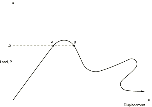 ProductsAbaqus/StandardAbaqus/CAE Unstable responseGeometrically nonlinear static problems sometimes involve buckling or collapse behavior, where the load-displacement response shows a negative stiffness and the structure must release strain energy to remain in equilibrium. Several approaches are possible for modeling such behavior. One is to treat the buckling response dynamically, thus actually modeling the response with inertia effects included as the structure snaps. This approach is easily accomplished by restarting the terminated static procedure (Restarting an analysis) and switching to a dynamic procedure (Implicit dynamic analysis using direct integration) when the static solution becomes unstable. In some simple cases displacement control can provide a solution, even when the conjugate load (the reaction force) is decreasing as the displacement increases. Another approach would be to use dashpots to stabilize the structure during a static analysis. Abaqus/Standard offers an automated version of this stabilization approach for the static analysis procedures (see Static stress analysis, Quasi-static analysis, Fully coupled thermal-stress analysis, or Coupled pore fluid diffusion and stress analysis). Alternatively, static equilibrium states during the unstable phase of the response can be found by using the “modified Riks method.” This method is used for cases where the loading is proportional; that is, where the load magnitudes are governed by a single scalar parameter. The method can provide solutions even in cases of complex, unstable response such as that shown in Figure 1. Figure 1. Proportional loading with unstable response.