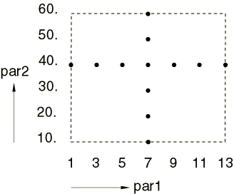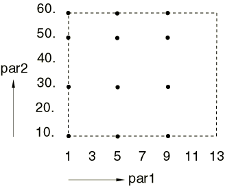 ![]() A second use of the combine command preceded by a respecification of the parameter sampling study.sample(NUMBER, par='par1', number=3) study.sample(NUMBER, par='par2', number=3) study.combine(MESH, name='dSet2') creates designs at the following nine points: (1, 10.), (7, 10.), (13, 10.), (1, 35.), (7, 35.), (13, 35.), (1, 60.), (7, 60.), and (13, 60.) (see Figure 2). The extreme and center values of both parameters are combined. Figure 2. Design points in design set dSet2