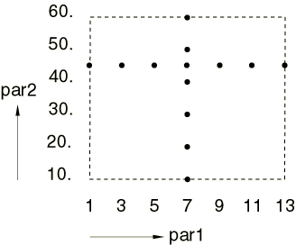 ![]() A second invocation of the above combine command after respecifying par2 as study.define(CONTINUOUS, par='par2', domain=(10., 60.), reference=45.) study.combine(CROSS, name='dSet6') creates designs at the following 13 design points: (1, 45.), (3, 45.), (5, 45.), (7, 45.), (9, 45.), (11, 45.), (13, 45.), (7, 10.), (7, 20.), (7, 30.), (7, 40.), (7, 50.), and (7, 60.) (see Figure 6). Constraining designsA constraint that determines the allowable design points in the parametric study can be specified using the aStudy.constrain scripting command (see aStudy.constrain()). When such a constraint is specified, existing designs that violate the constraint are eliminated immediately. For example, the constrain command aStudy.constrain('height*width < 12.')