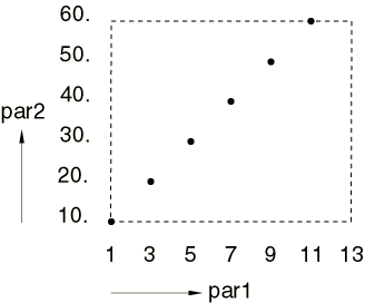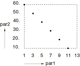![]() A second invocation of the above combine command after respecifying the par2 sampling as study.sample(INTERVAL, par='par2', interval=-10.) study.combine(TUPLE, name='dSet4') creates designs at the following 6 points: (1, 60.), (3, 50.), (5, 40.), (7, 30.), (9, 20.), and (11, 10.) (see Figure 4). This represents the other diagonal in the two-parameter space. Figure 4. Design points in design set dSet4