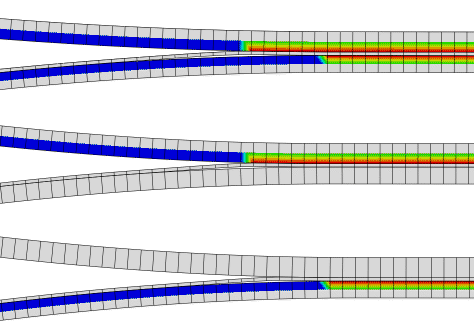 ProductsAbaqus/StandardAbaqus/Explicit Problem descriptionThe model with cohesive elements is analyzed in Abaqus/Standard as well as Abaqus/Explicit and uses a damaged, linear elastic constitutive model. The model with VCCT criterion is also analyzed in both Abaqus/Standard and Abaqus/Explicit to predict debond growth. In addition, the model with VCCT criterion in Abaqus/Standard is analyzed using the Paris law to assess the fatigue life when it is subjected to sub-critical cyclic displacement loading. Geometry and modelThe problem geometry and loading are depicted in Figure 1: a layered composite specimen, 200 mm long, with a total thickness of 3.18 mm and a width of 20 mm, loaded by equal and opposite displacements in the thickness direction at one end. The maximum displacement value is set equal to 20 mm in the monotonic loading case. In the low-cycle fatigue analysis, cyclic displacement loading with a peak value of 1 mm is specified. The thickness direction is composed of 24 layers. The model has two initial cracks: the first (of length 40 mm) is positioned at the midplane of the specimen at the left end, and the second (of length 20 mm) is located to the right of the first and two layers below. When cohesive elements are used, the problem is modeled in both two and three dimensions, using solid elements to represent the bulk behavior and cohesive elements to capture the potential delamination at the interfaces between the 10th and 11th layers and between the 12th and 13th layers, counting from the bottom. In the two-dimensional finite element model the top part of the specimen (consisting of 12 layers), the middle section (2 layers), and the bottom part (10 layers) are each modeled with a mesh of 1 × 200 CPE4I elements in Abaqus/Standard and CPE4R elements in Abaqus/Explicit. In both Abaqus/Standard and Abaqus/Explicit the initially uncracked portions of the two interfaces are modeled by one layer each of COH2D4 elements that share nodes with the adjacent solid elements. A similar, matching mesh is adopted for the equivalent three-dimensional model, where the corresponding element types used areC3D8I and COH3D8 in Abaqus/Standard and C3D8R and COH3D8 in Abaqus/Explicit, with one element in the width direction. The nodes where the equal and opposite displacements are prescribed are constrained in the length direction of the specimen; these are the only boundary conditions in the two-dimensional case. For the equivalent three-dimensional model all the nodes are also constrained in the width direction to simulate the plane strain effect. In addition, contact is defined between the open faces of the second, pre-existing crack to avoid penetrations if the faces are compressed against each other during the analysis. In Abaqus/Standard, when the surface-based traction-separation capability available with the contact pair algorithm is used, the problem is modeled in both two and three dimensions. In Abaqus/Explicit the problem is modeled in three dimensions since surface-based traction-separation is available with the general contact algorithm, which is available only for three-dimensional models. The models are very similar to those created for use with cohesive elements, as described in the previous paragraph, except that the cohesive elements are replaced with cohesive surfaces. When the VCCT debond method is used, the problem is modeled in two dimensions in Abaqus/Standard but in three dimensions in Abaqus/Explicit. The models created above can also be adopted. Instead of using cohesive elements or traction-separation in contact in Abaqus/Standard, you can activate the crack propagation capability with the VCCT criterion. The same model is also used in a low-cycle fatigue analysis. When the same model is analyzed using Abaqus/Explicit, the VCCT criterion is obtained by assigning contact clearances, specifying cohesive behavior properties, and specifying crack propagation criteria with general contact. When connector elements are used, the problem is modeled only in two dimensions in Abaqus/Standard. Two node-based surfaces are generated: one along the top surface of the tenth layer and the other along the bottom surface of the eleventh layer. Both surfaces are tied to adjacent layers using surface-based tie constraints. CARTESIAN connector elements are used to bond the two node-based surfaces together to represent the interface. For the interface between the twelfth and thirteenth layers, matched solid element nodes along the interface are connected directly using connector elements. MaterialThe material data given in Alfano (2001) for the bulk material composite properties are GPa, GPa, GPa, , , , GPa, GPa, and GPa. The response of the cohesive elements in the model is specified through the cohesive section definition as a “traction-separation” response type. The elastic properties of the cohesive layer material are specified in terms of the traction-separation response with stiffness values MPa, MPa, and MPa. The quadratic traction-interaction failure criterion is selected for damage initiation in the cohesive elements; and a mixed-mode, energy-based damage evolution law based on a power law criterion is selected for damage propagation. The relevant material data are as follows: MPa, MPa, MPa, × 103 N/m, × 103 N/m, 0.80 × 103 N/m, and . The same damage initiation criterion and damage evolution law with the same damage data are used for the surface-based traction-separation approach. However, in the absence of cohesive elements, their thickness is accounted for by scaling the elastic properties by a factor of 0.0132 × 10–3 (since the cohesive elements have a thickness of 0.0132 mm), and the properties are specified as 64,200 GPa, 64,200 GPa, and 64,200 GPa. For the VCCT debond approach, the BK mixed-mode failure law is used with the same critical energy release rates as those used for cohesive elements; i.e., × 103 N/m, × 103 N/m, and 0.80 × 103 N/m. The exponent of the 