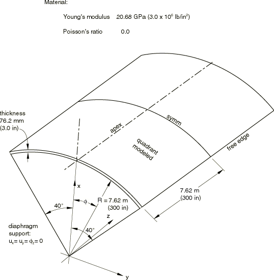 ProductsAbaqus/StandardAbaqus/Explicit Over the past several years a small set of linear test cases has emerged as a critical test set for shell elements (see, for example, the collection of papers on numerical modeling of shells—edited by Ashwell and Gallagher, 1976—and the survey paper by Belytschko, 1986). The set contains three cases: the barrel vault roof (this example), the cylinder with end diaphragm support subjected to pinching loads (The pinched cylinder problem), and the point loaded hemispherical shell (LE3: Hemispherical shell with point loads). It has been generally accepted that any elements that perform well on all three cases should provide accurate results for most general shell problems. These test cases are included in this guide so that the performance of the shell elements offered in Abaqus can be assessed. Most modern shell elements, including those in Abaqus, do a good job on these problems. Although this is an indication that the elements usually provide good results, it should not be taken as a sufficient demonstration of the quality of an element's performance in all cases. For example, all three of these problems are completely regular geometries; the candidate element's usefulness in irregular geometries (and most practical cases involve a high degree of geometric irregularity) is not tested. In this example we make some attempt to address this issue by modeling not only with the regular mesh that would be the natural choice for the problem, but also with a mesh that might be the basis of analysis of a problem with the same underlying shape but with some type of local, irregular feature, such as a crack. Results for both types of mesh are reported below. As would be expected, the irregular mesh results are not as good as those provided by a regular mesh with the same number of variables. Problem descriptionThe problem is shown in Figure 1. The physical basis of the problem is a deeply arched roof supported only by diaphragms at its curved edges (an aircraft hanger), deforming under its own weight. It is interesting to observe that the geometry is such that the center point of the roof moves upward under the self-weight (downwardly directed) load. Perhaps this is one reason why the problem is not straightforward numerically. Two discretizations are studied: a regular meshing and an irregular meshing of the type that might be used when a local refinement is desired (Figure 2). This method of mesh refinement is not being recommended: the irregular meshing is introduced here simply to record some results for the shell element used in this way. The actual roof spans 15.24 m (600 in) between supports and has a thickness of 76.2 mm (3 in), so it would be considered to be a “thin” shell. Some of the shell elements in Abaqus/Standard (element types S4R5, S8R5, S9R5, STRI3, and STRI65) are intended to be used as thin shells. In these elements the Kirchhoff assumption, that lines initially normal to the shell's reference surface remain normal to that surface during the deformation, is imposed either algebraically (in element type STRI3) or numerically (in element types S4R5, S8R5, S9R5, and STRI65). Shell elements S4R, S4, and S3R and continuum shell elements SC6R and SC8R use an assumed strain treatment for the transverse shear that imposes the Kirchhoff constraint numerically for thin shells and provides accurate transverse shear predictions for thick shells. Element types S4R, S4, S3R, SC6R, and SC8R are, hence, valid for both thin and thick applications. Element type S8R is mainly intended to be used for thick shell modeling, where transverse shear flexibility may be an important part of the deformation. When this element is used to model thin shells, the transverse shear stiffness is treated as a penalty to impose the Kirchhoff assumption discretely, the penalty being chosen based on the technique described by Hughes et al. (1977). In Abaqus/Explicit the problem is modeled using S4 elements, S4R elements with enhanced hourglass control, S3R elements, and S3RS elements. Results and discussionThe results for both the regular and irregular meshes are described below. Regular meshThese results are summarized in Table 1, where the vertical motion of the center of the free edge is recorded. The generally accepted solution for this single displacement value, based on deep shell theory, is 91.2 mm (3.59 in) (see the chapter by Ashwell in Ashwell and Gallagher (1976) for a discussion of both semianalytical and purely numerical solutions to this example). Table 1 records the error in this single displacement value compared to this “exact” solution. From Table 1 it is apparent that the second-order thin shell elements (S8R5, S9R5) are the most effective elements for this problem, with S8R, STRI65, and the first-order quadrilaterals (S4, S4R5, S4R) providing almost as good a solution except for the coarsest mesh used. Irregular meshThe results provided by the irregular mesh models are summarized in Table 2. These results are not as accurate as the results provided by regular mesh models having roughly the same number of elements and degrees of freedom. Nevertheless, when a relatively fine mesh is used, all the elements provide acceptable results even with the irregular mesh pattern. The poor accuracy of the results provided by element type S8R with the coarse irregular mesh is particularly noticeable and serves as a warning of how important it is to use a regular mesh with this element type in a thin shell in which there are high strain gradients. SummaryIn summary, based on this example: