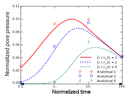 ![]() Figure 3. Variation of normalized pore pressure with normalized time at three different radii.