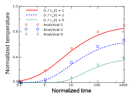![]() Figure 2. Variation of normalized temperature with normalized time at three different radii.