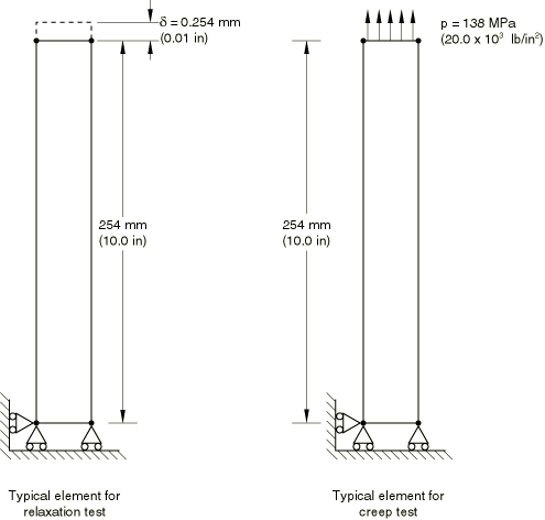 ProductsAbaqus/Standard Problem descriptionModel for simple creep and relaxation testsThe model for the simple creep and relaxation tests contains eight independent, single-element specimens, as shown in Figure 1. The input files for both the creep and relaxation tests are given in creep_usr_creep.inp and creep_relax_usr_creep.inp. All of the elements are plane stress elements. The plane stress case provides the most rigorous verification because plane stress is usually the most difficult case for integrating the type of rate constitutive model that arises in classical metal creep theories. The eight elements are divided into two groups of four. One group is subjected to a creep test, and the other group models a relaxation experiment. Creep behavior can be defined in Abaqus directly on data lines (for simple creep laws) or by a user subroutine. In either case time or strain hardening can be used. To test all of these possibilities, the material definitions for the elements are set up as follows: