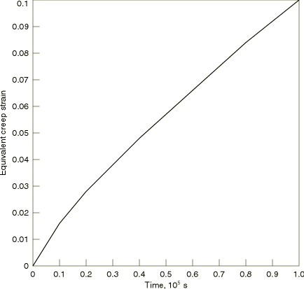Models for coupled creep and plasticity testsThe models used to verify the integration of coupled creep and plasticity constitutive behavior consist of a single element of unit dimension. The test case employing the Mises model (creep_mises.inp) uses a plane stress element simulating a tensile test. The test cases using the Drucker-Prager model (creep_druckercap_ramp.inp) and extended Drucker-Prager/Cap model (creep_druckercap_ramp.inp) use a solid element. The first simulates a tensile test, and the second, a compression test. A time hardening creep law is used for the Mises and the Drucker-Prager test cases; a Singh-Mitchell type creep law is defined for the modified Drucker-Prager/Cap model. MaterialFor all test cases the elastic material properties use a Young's modulus of 138 GPa (20 × 106 psi) and a Poisson's ratio of 0.3. In the creep and relaxation tests (first part of the example) the material definition uses creep behavior with the Mises stress potential and the equivalent uniaxial creep strain rate defined by where q is the Mises equivalent stress, t is time in the time hardening case, or—in the strain hardening case— A, n, and m are constants, which are defined here as 1.6 × 10−16 MPa−5 sec−0.8 (2.5 × 10−27 psi−5sec−0.8), 5, and −0.2. For the strain hardening case t can be eliminated from the creep strain rate definition, giving The time hardening creep law defined above with 1.6 × 10−16 MPa−5 sec−0.8 (2.5 × 10−27 psi−5sec−0.8) is specified for the coupled Mises and the coupled Drucker-Prager models. The plasticity hardening curve is given by where is the equivalent plastic strain, 69 MPa (1 × 104 psi), and 0.2. The Drucker-Prager model is reduced to a Mises model by specifying the material angle of friction, 0.0, and the dilation angle, 0.0. No intermediate principal stress effect is used (i.e., 1.0), as is required by this type of model. A Singh-Mitchell type creep law is used for the case employing the modified Drucker-Prager/Cap model, activating the cohesion mechanism only. This creep strain rate is defined by where is the equivalent uniaxial compression creep stress, and the constants 2.5 × 10−5 sec−1 (2.5 × 10−5 sec−1), 1.45 × 10−2 MPa−1 ( 0.0001 psi−1), 1.0, and 0.0. Solution controlAbaqus begins the analysis with explicit integration and continues to use that method unless its stability limit appears to be too severe a restriction on the size of the time increment or if plasticity occurs. If one of these conditions occurs, Abaqus switches to the backward difference method; thus, the integration is unconditionally stable, and the only limitation on time increment size is solution accuracy. This approach is usually the most economic method for applications involving this type of material behavior. The accuracy of the time integration of the creep behavior is determined by the size of the time increments chosen by the automatic time incrementation scheme, which is controlled by a tolerance specified in the quasi-static procedure (Quasi-static analysis). This tolerance limits the difference between the creep strain increments computed from the creep strain rates calculated from conditions at the beginning and at the end of the increment. In a case such as this, where the creep strain rate depends strongly on the stress, the usual guideline for setting this tolerance is to decide on a value that represents a small error in the stress and then divide that value by the elastic modulus to determine the setting. For the creep and relaxation tests we have used 0.69 MPa (100 lb/in2) as a small stress; hence, the tolerance is chosen as 5 × 10−6. For the coupled Mises and coupled Drucker-Prager tests a tolerance of 1 × 10−4 showed sufficient accuracy, and for the modified Drucker-Prager/Cap test a tolerance of 5 × 10−6 was selected. Exact solutionsFor the one-dimensional cases observed here, the uniaxial stress is equal to the effective stress, q, and also equal to the equivalent creep test stress, In the creep test the creep law can be integrated directly to give This solution is the same for both time and strain hardening. It is plotted in Figure 2. In the relaxation test the strain is constant, so For the time hardening assumption this gives which integrates to give where is the stress at the start of the event. This solution is shown in Figure 3. For the strain hardening assumption the governing equation becomes Since the strain is constant, and at any time. Thus, the governing equation defines the stress by so q is defined by This equation is integrated numerically, using a fourth-order Runge-Kutta scheme, with a time increment of one second, which should provide a solution of high accuracy. The solution is plotted in Figure 3. For the relaxation test the solutions provided by the time hardening and strain hardening models are slightly different. In the second part of this example, the closed-form solution for the creep strain of both the Mises and the Drucker-Prager models can be obtained by integrating the strain rate. The following is the exact solution for the total strain prior to yielding: where is the initial yield stress occurring at time . After the onset of yield, the exact solution for the total strain is as follows: For the case employing the modified Drucker-Prager/Cap model, a very high value of yield stress is specified to prevent yielding. Thus, a closed-form solution of the total strain can easily be obtained: Results and discussionIn the creep test (creep_usr_creep.inp) Abaqus uses explicit integration for the first 2.57 sec. When the time increment is 1.28 sec and is being restricted to that value by the conditional stability of the explicit operator, the switch to implicit integration occurs. Toward the end of the time period, time increments of more than 40,000 seconds are being used. For this case the Abaqus results all agree with the exact solution, which is to be expected. The creep test is