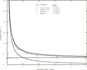ProductsAbaqus/Standard Because of the time-dependent effects of creep deformation, there is no one parameter that characterizes the stress state around the crack tip for all circumstances. The appropriate parameter to use depends on the details of the constitutive law (whether the law describes primary, secondary, or tertiary creep) and on the stage of deformation of the material around the crack tip. In addition, creep deformation can occur in either an initially elastic or an initially plastic stress field. Riedel (1981) discusses which parameters are correct for different circumstances. When the initial response of the material is linear elastic and secondary creep dominates the creep behavior, the stress intensity factor, , and the path independent integral, , are the relative loading parameters. For small-scale creep (that is, when elastic strains dominate almost everywhere in the specimen except in a small zone that grows around the crack tip), governs crack growth initiation. If, however, the creep zone becomes large compared to the specimen size and the elastic strains small compared to the creep strains, is the appropriate fracture parameter. The fracture mechanics parameter offered by Abaqus characterizes crack growth behavior for a wide range of creep conditions. For stationary cracks characterizes the rate of growth of the crack-tip creep zone under small-scale creep conditions and is also related to the stress intensity factor Under extensive secondary creep conditions, and is path independent throughout the extensive creep region. Problem descriptionA shallow edge-crack in a half space in plane strain, subjected to constant Mode I far-field tensile loading, is considered. The geometry is shown in Figure 1. Initially the edge crack is stress free. At time 0+ a tensile stress, , is applied suddenly on the circular boundary and held constant thereafter. The instantaneous response is purely elastic since creep deformation develops over a period of time. The crack-tip stress field is, thus, initially characterized by linear elastic fracture mechanics. With the load held constant, subsequent creep deformation causes a relaxation of the crack-tip stresses until, as , a steady-state stress distribution is reached. The results for this problem are documented by Bassani and McClintock (1981). The crack length, a, is 10 mm. As a result of symmetry, only one-half of the body needs to be analyzed. The mesh is comprised of CPE8R elements. Eleven rings of elements are focused radially at the crack tip, with 12 element divisions in the 180° modeled circumferentially. This focused portion of the mesh is connected to the outer portion shown in Figure 2. The innermost ring of elements at the crack tip are degenerated into triangles. The three nodes along one side of the 8-node element are defined such that they share the same location; the other side nodes remain at the midpoints. Each of the three collapsed nodes can displace independently, so the interpolation function exhibits a r−1 singularity in displacement derivatives. The reduced-integration (CPE8R) element is chosen since it does not “lock” during the incompressible creep deformation. The incompressibility constraint can also be modeled successfully with hybrid (mixed) formulation elements. The results obtained with both elements are in close agreement. A file with input data using hybrid elements is provided with the Abaqus release. No mesh convergence studies have been performed. MaterialThe material behavior includes linear elasticity and secondary creep response. The material is assumed to be isotropic elastic, with a Young's modulus of 200 GPa and a Poisson's ratio of 0.3, and with uniaxial creep behavior defined by where A is 5.0 × 10−12 per hour (stress in MPa) and 3. LoadingThe load is a constant far-field tension of /2000 applied to the circular boundary edge of the model by applying concentrated loads (equivalent to a pressure of 100 MPa) to the nodes on the circumference. The load is applied instantaneously and then held constant until steady-state creep conditions are reached. The initial application of the load is assumed to occur so quickly that it involves purely elastic response. This behavior is obtained by using the static procedure. The creep response is then developed in a second step, using the quasi-static procedure. During the quasi-static step a user-specified tolerance is required to control the time increment choice and, hence, the accuracy of the transient creep solution. A maximum elastic principal stress of 2800 MPa occurs at the crack tip; therefore, errors in stress of about 20 MPa will make a small difference to the creep strain added within an increment. Converting this stress error to a strain error by dividing it by the elastic modulus gives a value for the accuracy tolerance of 1 × 10−4. If only an estimate of is required, a high value for the tolerance can be used. This allows Abaqus to use the largest possible time increments that result in a value of low accuracy during the transient but reach the steady-state value at minimum cost. 1000 hours of response are requested, which is sufficient to reach steady-state conditions. Results and discussionFigure 3 shows the displaced shape of the mesh near the crack tip at steady state. The -integral is only path independent in the limiting case when steady-state conditions are reached. The path dependence of during transient creep is shown in Figure 4. The figure shows the variation of with the radius of the contour, r, measured at different times during the early part of the creep history (before the transition time, , defined at the end of this discussion, is reached). We define the radius for the nth contour, r, as the distance from the crack tip to the outer ring of nodes of the nth ring of elements surrounding the crack tip. Path independence is reached as time increases. The difference between the second and fifth contour values is les