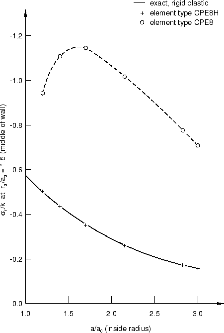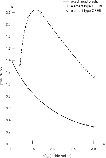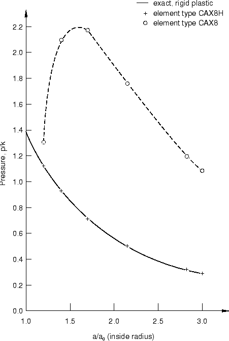 LoadingThe cylinder is expanded by applying internal pressure. Following initial yielding, the cylinder reaches a limit state, after which the pressure decreases rapidly as the cylinder expands. This load-displacement behavior is unstable (softening) and, therefore, requires use of the modified Riks algorithm for solution under load control. Another approach, followed here, is to load the cylinder by prescribing the radial displacement at the innermost nodes. The pressure is then computed from the reaction forces conjugate to these prescribed radial displacements. (Snap-through buckling analysis of circular arches and Snap-through of a shallow, cylindrical roof under a point load, among others, illustrate the use of the modified Riks algorithm.) The cylinder is expanded to three times its initial radius in a small number of increments. This requires very large strain increments and would probably be too large for a more complicated problem that involves shear and rotation as well as direct straining. However, large strain increments are suitable for this simple case. Results and discussionAs the strains are so large, the results should compare very closely with the exact, rigid-plastic solution of Prager and Hodge (1951). That exact solution gives the stresses as follows: where k is the yield stress in pure shear ( times the yield stress in pure tension); a0 is the initial inside radius; b0 is the initial outside radius; r0 is the radius, in the initial configuration, of the material point at which the stresses are being calculated; and is the current value of the inside radius. The form of the solution shows that we need only compare the radial stress, since the other stresses are obtained directly from that component. The results for the axisymmetric element models are summarized in Figure 2 and Figure 3, while Figure 4 and Figure 5 show the results for the plane strain models. Figure 2 compares the pressure versus inside radius given by the CAX8H and CAX8 finite element models to that given by the exact, rigid-plastic solution. All of the axisymmetric models agree very closely with the exact solution with the exception of that using the fully integrated 8-node (CAX8) element. Recall that the solution is obtained by prescribing the motion of the inside surface of the cylinder, so the pressure is calculated for the finite element models from the reaction forces conjugate to these prescribed displacements. Figure 3 compares the stress calculated by Abaqus at the point initially halfway through the cylinder wall ( 1.5) to the exact, rigid-plastic solution. Again, with the exception of the CAX8 element model, there is excellent agreement with the analytical solution. Figure 4 and Figure 5 show similar results to Figure 2 and Figure 3 for the plane strain models. Again, with the exception of the fully integrated 8-node (CPE8) element model, all of the plane strain models show excellent agreement with the exact, rigid-plastic solution. The pure displacement 8-node elements (CAX8 and CPE8) give poor results because the strains are calculated directly from the interpolation functions at each integration point, and the incompressibility requirement causes a severe oscillation in the mean pressure stress throughout each element. However, in the hybrid, 8-node elements the mean pressure stress is interpolated independently, so an accurate value is obtained for this variable. In addition, the 4-node elements in Abaqus are constant strain/stress elements for this case (because these elements are coded with a constant hoop strain value and use “selective reduced integration,” in which the volume strain is computed at the centroid only), and so also provide accurate pressure stress values. Results for models using the fully integrated versions of axisymmetric and plane strain elements are shown here to caution the user. With rare exceptions the fully integrated 8-node quadrilaterals are not as effective as the reduced integration versions of the same elements; the reduced integration 8-node quadrilaterals are, hence, almost always recommended over their fully integrated counterparts. This particular problem gives a dramatic illustration of a difficulty encountered with full integration in a problem in which the bulk behavior of the material is very much stiffer than the shear behavior, a type of behavior commonly encountered. Input files