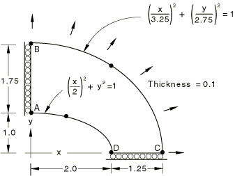 ProductsAbaqus/StandardAbaqus/Explicit Elements testedCPS3 CPS4 CPS4I CPS4R CPS6 CPS6M CPS8 CPS8R Problem descriptionModel:Plane stress problem with shape defined by ABCD. Functions defining the curves BC and AD are given above. Mesh:A coarse and a fine mesh are tested for each element. In addition, a very fine mesh is tested for each element in the explicit dynamic analysis. Material:Linear elastic, Young's modulus = 210 GPa, Poisson's ratio = 0.3, density = 7800 kg/m3. Boundary conditions:along edge AB, along edge CD. Loading:Uniform outward pressure of 10 MPa at outer edge BC. In the explicit dynamic analysis the loading is applied such that a quasi-static solution is obtained. Reference solutionThis is a test recommended by the National Agency for Finite Element Methods and Standards (U.K.): Test LE1 from NAFEMS publication TNSB, Rev. 3, “The Standard NAFEMS Benchmarks,” October 1990. Target solution: Tangential edge stress () at D is 92.7 MPa. Results and discussionThe results are shown in Table 1 and Table 2. The values enclosed in parentheses are percentage differences with respect to the reference solution.