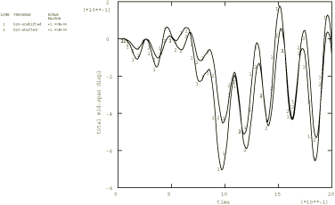 ![]() Figure 3. Total transverse displacement response of beam midspan to base excitations with and without the 0.25 second time shift.