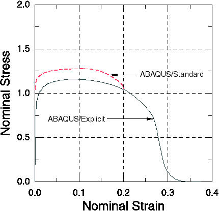 ProductsAbaqus/StandardAbaqus/Explicit Problem descriptionWe consider a long specimen with a circular cross-section. The specimen has an initial length of 2 and a radius of , with = 4. is assumed to be equal to 1 unit. Only a quarter of the specimen needs to be analyzed because of the symmetry about the and axes. Figure 1 shows the mesh used in the analysis. Both the geometry and the deformation are assumed to be axisymmetric. Axisymmetric elements are used, and the mesh is refined near the center of the specimen because of the expected softening and intense deformation in that region. An initial geometric imperfection is used to induce necking in the specimen analyzed with Abaqus/Standard. In Abaqus/Explicit the imperfection is not needed because stress wave effects induce necking at the center of the bar. MaterialThe material properties used in the computation are: