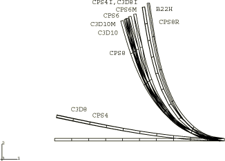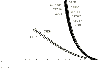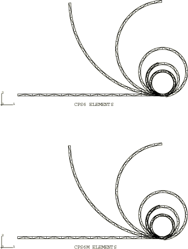 ProductsAbaqus/Standard Problem descriptionThe cantilever is 10 m long. A circular pipe cross-section of outer radius 0.1 m and wall thickness 0.01 m is used for closed-section beam elements so that the beam is moderately slender (100). This type of problem becomes considerably more difficult numerically as the slenderness ratio increases. The standard beam elements in Abaqus should have little difficulty up to slenderness ratios of 1000, but above that the hybrid elements are usually required. However, for this example we have elected to use hybrid elements throughout since they result in better convergence for problems where the beam remains inextensible—in this case, the moment load problem, and to a certain degree, the transverse load problem. Young's modulus is chosen as 100 MPa. The model consists of three elements for the transverse load case and either 10 or 20 elements for the moment load problem, depending on whether linear or quadratic elements are used. Open-section beam elements of type B31OS, B32OS, B31OSH, and B32OSH can be used with ARBITRARY, GENERAL, and I section types. To test these elements, the cross-section is defined as an I-beam with a height of 200 mm, a width of 100 mm, and web and flange thicknesses of 10 mm. An additional degree of freedom (7) defines the amplitude of the cross-sectional warping. Since the problems considered here are two-dimensional, the torsion and warping considerations are irrelevant. For the continuum elements the solid section thickness and height are chosen to be 100 mm and 147.8 mm, respectively, so that the section moment of inertia is identical to that of the pipe section defined above. The section moment of inertia determines the bending behavior, which is the dominant deformation for both cases since axial deformation is insignificant. We measure the performance of the incompatible mode elements, CPS4I and C3D8I; the second-order elements, CPS8, CPS8R, CPS6, CPS6M, C3D10, C3D10HS, and C3D10M; and the first-order elements, CPS4, CPS4R, C3D8, and C3D8R. The corresponding second-order three-dimensional elements, C3D20 and C3D20R, are not included but can be expected to provide about the same results as the CPS8 and CPS8R elements, respectively. A single layer of elements is used in all the meshes. The reduced-integration, linear elements, CPS4R and C3D8R, when used with enhanced hourglass control give good results that match the results obtained using incompatible mode elements since both are based on an assumed strain formulation. Two mesh types are used for the transverse load case: a coarse mesh of 1 × 10 for the first-order elements and 1 × 5 for the second-order elements and a fine mesh of 1 × 20 for the first-order elements and 1 × 10 for the second-order elements. For the moment load case a 1 × 40 mesh is used with the element types tested (CPS4I, CPS4R, CPS8R, CPS6, CPS6M, and C3D8R). A fine mesh is needed to converge to the correct result; for this loading case a 1 × 20 mesh results in a noticeably stiffer response. For comparison purposes, reduced-integration linear membrane (M3D4R), shell (S4R), and continuum shell (SC8R) elements are used with enhanced hourglass control for the transverse load and moment load cases with the same meshes as for CPS4R elements. In addition, continuum shell meshes are provided for the transverse load and moment load cases with similar meshes as for C3D8R elements. LoadingFor the transverse load case a total vertical load of 269.35 N is applied at the tip of the cantilever, which causes the tip to deflect more than 8 m. For the moment load problem two different methods of applying the load to the beam tip are used. In the first a moment of 3384.78 N-m is applied to the end of the closed-section pipe beam and a moment of 2873.09 N-m is applied to the open-section I-beam. In the second method, which is most commonly used for prescribing rotations of more than radians, a constant angular velocity of 12.5664 rad/time is prescribed at the tip. Since the problem under consideration is a static analysis, Abaqus interprets the angular velocity in terms of the normalized time used for incrementation. An amplitude reference is used to keep the angular velocity constant. The beam will wind around itself twice with either the applied moment or the prescribed angular velocity. Boundary conditions in Abaqus/Standard and Abaqus/Explicit provides details of the method illustrated here to prescribe rotations of more than radians. For the continuum elements the moment is applied through a distributing coupling constraint. The distributing coupling constraint is used to couple the nodes at the cantilever tip to a reference node placed at the tip. The moment is applied to this reference node resulting in a force-couple at the bottom and top nodes of the cantilever tip. Results and discussionDisplacement plots for the transverse load case are shown for the coarse and fine meshes in Figure 1 and Figure 2. Figure 3 and Figure 4 plot the displacement histories of the tip of the cantilever for the various elements. For both coarse and fine meshes using B22H, CPS8R, CPS4I, and C3D8I elements the displacements compare well with the exact solution for the inextensible beam, as given by Bisshopp and Drucker (1945). The displacements for CPS8, CPS6, CPS6M, C3D10, C3D10HS, and C3D10M improve significantly with the fine mesh, indicating good convergence. As expected, the linear full-integration elements, CPS4 and C3D8, give very stiff responses. For the moment load problem the deformed shapes of the beams for elements B21H, CPS4I, CPS6, CPS6M, and CPS8R, at various increments throughout the step, are shown in Figure 5 and Figure 6. The analytical solution for this problem is , where n is the number of times the rod will wind around itself. In our problem we have 2, as shown by the final deformed shapes. These analyses can be extended, by minor modifications to the data, to several other interesting large-displacement