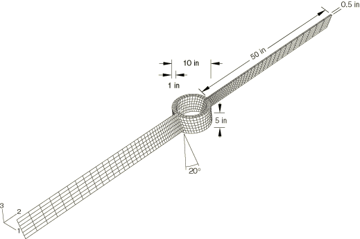 ProductsAbaqus/Explicit Problem descriptionThe rotation of a propeller that has an initial spin rate of 314.16 rad/s (3000 rpm or 50 revolutions per second) is simulated for a duration of 2 seconds. The propeller consists of a rigid central hub and two deformable blades, as shown in Figure 1. The hollow cylindrical hub is 5 inches (0.1270 m) long and has inner and outer radii of 4 inches (0.1016 m) and 5 inches (0.1270 m), respectively. The blades are 0.5 inches (0.0127 m) thick and span 50 inches (1.27 m). The blades make a 20° angle with the central axis of the propeller. The entire propeller assembly is made of steel with the following properties: