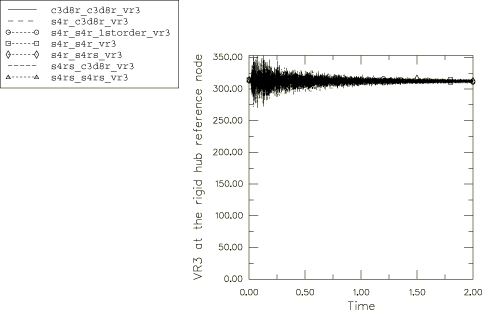 The propeller is assumed to be spinning in a vacuum with zero initial stresses. Once the stress state due to the centrifugal loading is established, the solution (displacements, stresses, and strains) is expected to oscillate about this state with time. The mass moment of inertia of the propeller about its central axis increases slightly due to the stretching of the blades in the mean stress state under the centrifugal loading. Since the angular momentum is conserved, the increase in the mass moment of inertia is expected to result in a mean spin rate that is slightly less than the initial spin rate. Meshing of the blades and the hubIn this study the hub region of the propeller is modeled as a rigid body that is discretized with C3D8R elements. The propeller blades are discretized with either S4R, S4RS, or C3D8R elements. Each propeller blade is discretized with a single element type, although two different element types can be used for the two blades. This leads to six different model permutations, all of which are studied in this example. Order of accuracy in element formulationSince the finite elements undergo a large number (> 5) of rigid body revolutions, the second-order accurate element formulation is specified in the section controls. The six models of the propeller problem with different element combinations are analyzed using second-order accurate elements. In addition, the model with both blades discretized using S4R elements is also analyzed using the default first-order accurate element formulation option. Results and discussionAll the analyses in this problem are performed using double precision floating point accuracy since the number of time increments to complete the simulation for a duration of 2 seconds is quite large (about 2.3 million increments with C3D8R elements in any of the two blades and about 1.3 million increments with shell elements in the both blades). A representative deformed configuration plot at the end of the 2 second time period is shown in Figure 2 for the model where S4R elements are used to discretize one blade and C3D8R elements are used for the other blade. The deformed configuration in all seven cases considered is free from element distortions, and in each case the propeller has undergone about 99.5 revolutions by the end of the 2 second time period. Correspondingly, a mean rotational velocity of about 312 rad/s is established with time as the mean stress state is reached from the initial stress-free state (see Figure 3). Figure 4 shows the total model energy (ETOTAL) and the total model kinetic energy (ALLKE) for the seven cases considered here. As ETOTAL remains constant, the energy balance is clearly maintained throughout the analysis. The kinetic energy is also fairly constant with time and is only about 0.4% lower than the initial kinetic energy of the model. This difference of 0.4% is explained by the internal energy of the elements. In general, the element elastic (ALLSE), artificial (ALLAE), and viscous (ALLVD) energies are found to be insignificant compared to the model kinetic energy (ALLKE). SummaryIn summary, based upon this example: