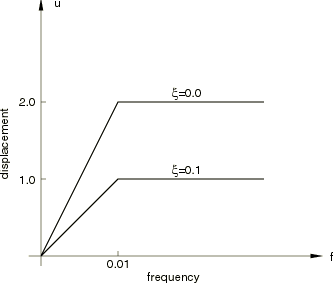 Modal dynamic analysisThis analysis is performed for three types of systems, described below. Tip load—damped systemThe time history response is obtained for the system when a load of 10 is applied suddenly and held fixed at node 4. Damping of 10% of critical damping in each mode is used. With this excitation the solution for , the amplitude of the ith eigenmode, is where is the frequency of vibration, is the fraction of critical damping, , t is time, and is the projection of the force onto the ith eigenmode. is given by where is the force at degree of freedom N ( 0, 10 in this case), is the component of the ith eigenvector at degree of freedom N, and is the generalized mass for the ith mode. Base acceleration—damped systemNext, the structure is excited by a constant acceleration of 1.0 at the fixed node (node 1), which is defined using base motion. It can be shown that the equations given above for force excitation can be used for this case when we define the force as where is the modal participation factor (defined in Variables associated with the natural modes of a model). Static preload—undamped system (one mode only)The modal dynamic step is a linear perturbation procedure and will start from the undeformed configuration by default. However, it is also possible to start the analysis from a deformed configuration by using a static linear perturbation procedure to create the deformed configuration. This step is followed by a modal dynamic step that specifies that the starting position is the linear perturbation solution from the previous step (General and perturbation procedures). This solution is projected onto the eigenvalues to give the initial modal amplitude: In general, this projection will preserve all the predeformation only if all of the modes of the system are included in the modal dynamic solution: if only a small number of the modes of the system are used in the modal dynamic analysis—as is the case in practical applications—this projection will only be approximate: that part of the predeformation that is orthogonal to the modes included in the analysis will be lost. In this analysis an initial displacement of 1.0 is given to node 4 using a boundary condition at this node in a static linear perturbation procedure. The frequency step is then done with the restraint at node 4 removed so that this node is free to vibrate in the subsequent modal dynamic step. (It is essential that the boundary condition be removed before the eigenvalue problem is solved for the natural modes of the system. Otherwise, incorrect modes—with the boundary condition still in place—will be obtained.) Only one mode is used, so some part of the static response is lost in the projection onto this mode. At the beginning of the modal dynamic step that carries over initial conditions, Abaqus calculates the initial values of the modal amplitude, using the equation given above, as 0.8293 for displacement normalization and 0.4779 for mass normalization. With no damping the response will, therefore, be for displacement normalization and for mass normalization. Response spectrum analysisThe displacement response spectra shown in Figure 1 are used in the next analysis. Spectra are defined in the figure for no damping and for 10% of critical damping in each mode. In this example 2% of critical damping is used so that the logarithmic interpolation gives a magnitude of 1.7411 for the maximum displacement for each mode. The analysis is done for two cases: absolute summation of the contributions from each mode and the square root of the sum of the squares (SRSS) summation. Since frequencies are well separated in this case, the use of the ten-percent summation method will give results that are identical to the SRSS method, the complete quadratic combination response will differ only by a small amount from SRSS (because of very small cross-correlation factors between the modes), and the Naval Research Laboratory summation method will calculate results that are very close to the absolute summation. For a comparison of all five summation rules, see Response spectra of a three-dimensional frame building. Absolute summation means that the peak displacement response is estimated as where is the displacement at degree of freedom k, is the ith eigenmode in degree of freedom k, is the maximum value for the amplitude in the ith mode, and is found from the appropriate spectrum definition S given in the input. In this case S is represented by displacement spectrum , applied in the global x-direction. SRSS summation estimates the peak displacement response as Steady-state analysisThe steady-state analysis procedure is verified by exciting the model over a range of frequencies. A load of the form where is the forcing frequency and 5, is applied to node 4 in the x-direction. Two kinds of damping are available for this type of analysis. One is modal damping, which defines the damping term for a mode as where is the fraction of critical damping. The other is structural damping, for which the damping force is defined as where and is the structural damping factor. Abaqus provides output as the response amplitude, , and phase angle, , for the ith mode. For this example, with only the real loads applied, the exact solution—with both modal and structural damping present—is and where is the amplitude of the forcing function, , projected onto the ith mode. The input file rodlindynamic_ssdynamics.inp requests a steady-state dynamic analysis for the forcing frequency range from 0.01 to 10 cycles/time. All three mode shapes are extracted with a frequency step and are used throughout the steady-state analysis, as indicated by the modal damping definition, where the damping value is defined to be 10% of critical damping in each mode. Random response analysisThe same rod model with structural damping present is now exposed to nondeterministic loading. The case we consider is uncorrelated white noise applied to all nodes. The exac