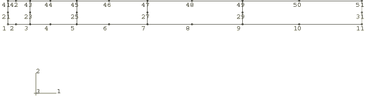 ProductsAbaqus/StandardAbaqus/Explicit The example shows that Abaqus can solve this type of problem. The Abaqus/Standard results also demonstrate that, because of the treatment of the pinned-edge condition, the load stiffness matrix associated with the pressure loading is not symmetric at the outer edge of the pressurized face of the disc. It is found that, after a small amount of straining, these nonsymmetric terms must be included in the stiffness matrix for the solution to be numerically efficient. Both a thick and a thin disc are tested. The solutions obtained using Abaqus/Explicit show dynamic effects when compared to the quasi-static solution found by Abaqus/Standard. The thin disc model in Abaqus/Explicit demonstrates the ability of Abaqus/Explicit to handle volume expansion of membrane-like structures; the application of fluid cavity elements in Abaqus/Explicit is also demonstrated. Problem descriptionThe radius of the thick disc analyzed in both Abaqus/Standard and Abaqus/Explicit is 190.5 mm (7.5 in), and its thickness is 12.7 mm (0.5 in). The thin disc analyzed in Abaqus/Explicit has the same radius and a thickness of 1.270 mm. The mesh used for the Abaqus/Standard analysis is shown in Figure 1. The mesh uses 5 axisymmetric continuum elements (type CAX8H) along the radial direction and one element through the thickness. These are 8-node, second-order, mixed formulation elements. Other elements are also used in the Abaqus/Standard analysis, particularly the lower-order incompatible mode elements, which perform comparatively as well as the second-order elements. When the modified elements, CAX6MH and C3D10MH, are used for this problem, a greater refinement of the mesh is required to ensure good performance. These elements are not used in the validation against published results. Since the maximum extension is expected to be at the center of the disc, the length of the elements in the radial direction decreases from the circumference to the center so that the element that is adjacent to the centerline is nearly square. This element size gradient is obtained by defining a parabola between the two end nodes and placing the third point (which defines the parabola) at a position between one-quarter and one-half of the distance from the centerline to the other end of the line of nodes, thus weighting the nodal generation toward the centerline of the disc. The problem is analyzed in two and three dimensions in Abaqus/Explicit, using different element types: continuum, shell, and membrane elements for the thick disc and shell and membrane elements for the thin disc. All cases use 10 elements in the radial direction and two elements through the thickness, twice as many as in the Abaqus/Standard analysis; hence, roughly the same number of degrees of freedom are used in both the dynamic solution and the quasi-static solution with a similar element grading in the radial direction. No attempt has been made at a mesh convergence study. The agreement with published results (Oden, 1972, and Hughes and Carnoy, 1981) for the quasi-static case suggests that the mesh used is adequate to predict the overall response accurately. The material is modeled as a Mooney-Rivlin material, with the constants (for the polynomial strain energy function) 0.55 MPa (80 lb/in2) and 0.138 MPa (20 lb/in2): these are the values used by Oden (1972) and Hughes and Carnoy (1981). In the Abaqus/Standard analysis it is an incompressible material. For the Ogden strain energy function, the equivalent material constants used are , 2, , and −2. Abaqus/Explicit requires some compressibility for hyperelastic materials. In the input files used here, is not given. Hence, a default value of is chosen. This gives an initial bulk modulus () that is 20 times higher than the initial shear modulus . This ratio is much lower than the ratio exhibited by most rubberlike materials, but the results are not particularly sensitive to this value because the material is unconfined. Decreasing by an order of magnitude has little effect on the overall results but causes a reduction in the stable time increment by a factor of due to the increase in the bulk modulus. For the continuum element cases the pinned condition at the outside of the disc requires special treatment. In the axisymmetric cases the central node on that edge (node 31) is fixed in both directions. The edge is constrained to remain straight, while still being able to change length, and is free to rotate about the pinned node. For simplicity these constraints are imposed by requiring that the displacement of the node at the top of the outer edge (node 51) be equal and opposite to that of the node at the bottom of the edge (node 11). Two equations are required: These constraints are imposed by using an equation constraint. The three-dimensional continuum case in Abaqus/Explicit (C3D8R) is treated in a similar manner by adding two more equations. Since only a wedge is actually modeled for the Abaqus/Standard three-dimensional analyses, the CYCLSYMMPC (General multi-point constraints) is used to impose the appropriate constraints. No constraints are required for the shell element cases. Loading and solution methodThe loading consists of a uniform pressure applied to the bottom surface of the disc. The modified Riks method is used in Abaqus/Standard since the loading is proportional and because the solution may exhibit instability. A pressure magnitude of 1.38 MPa (200 lb/in2) is specified: this magnitude is somewhat arbitrary since the Riks method is chosen. From other studies we expect that an initial pressure of about 0.014 MPa (2 lb/in2) should take the disc a reasonable way into the nonlinear regime. Hence, an initial increment of 0.01 and a period of 1 are specified in the static analysis to achieve this level of pressure in the initial increment. (Since the Riks algorithm is used, the actual pressure magnitude at the end of the first increment will differ somewhat from the init